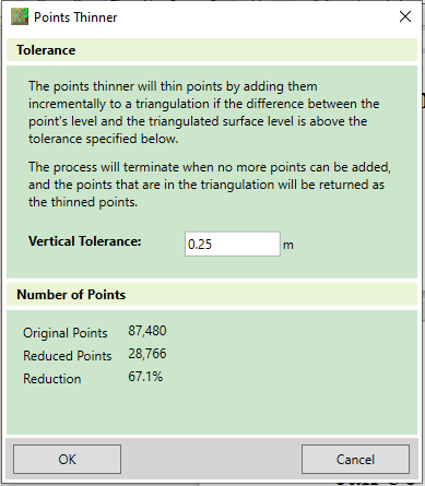 Both these processes produce data that can be loaded into Kubla Cubed as a point cloud. The one problem is that the data sets tend to be very large in sizes often they can be 10 million points in size. Kubla Cubed uses can in theory convert this data into TINs and analyse the volume difference, however memory, graphics and processor limits will start to be hit therefore Kubla Cubed has a built in point reduction algorithm. If you import a large data set you will get a message asking you if you want to reduce the point cloud. If you select yes you will get the point thinner window, as shown below: