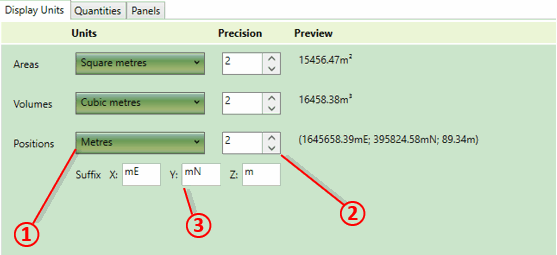 ① Units For each measurement type (areas, volumes, positions) you can select the desired unit of measure. It is recommended that you do not mix imperial and metric units together. For instance if areas and volumes are set to yards, then positions should be set to feet.