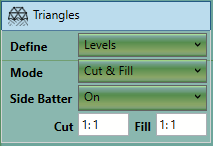The triangle surface boundary is joined to the ground by side slopes. The side batter (set as a ratio of vertical to horizontal)
