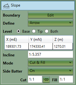This option allows you to define the slope with a single elevation at the base, an incline angle and a direction specified by the arrow. The arrow position can be controlled by dragging the tip, shaft or base of the arrow. The length of the arrow has no effect on the slope with this option.