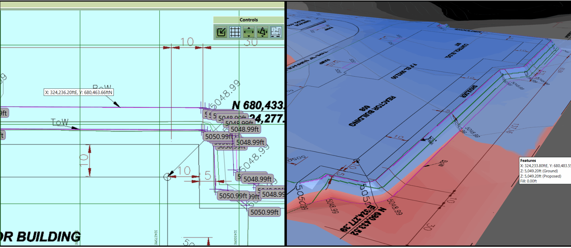 With the break-line method, you would first input the elevations on both sides of the wall. These would likely be points but could also be with contours that stop just shy of the wall. Then, you would input two break-lines: one at the top of the wall and one at the bottom. The gap between the break-lines would indicate the width of the wall slope when viewed on a plan. For instance, a near vertical wall would have break-lines very close, whereas as are gentle slope would be much wider.