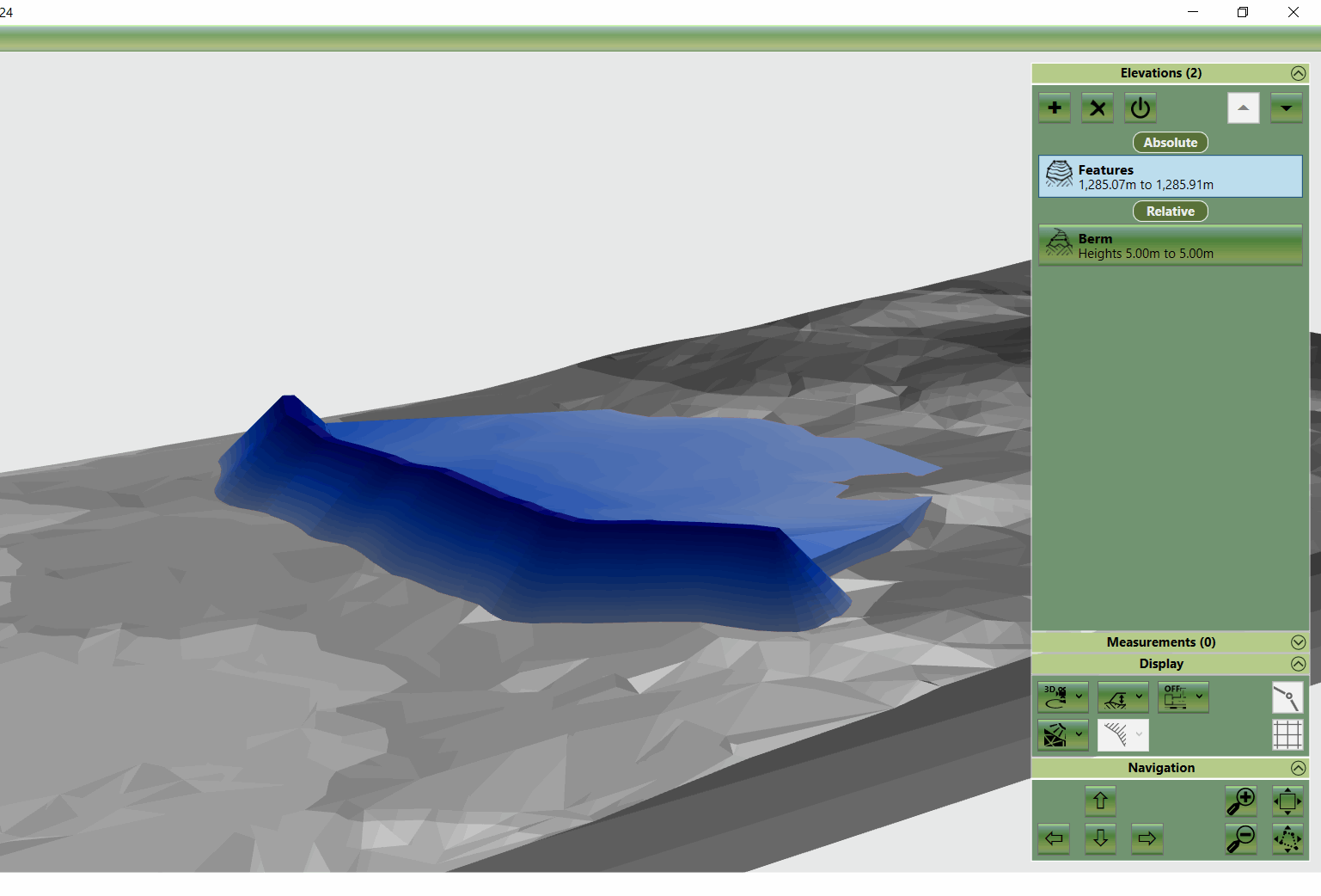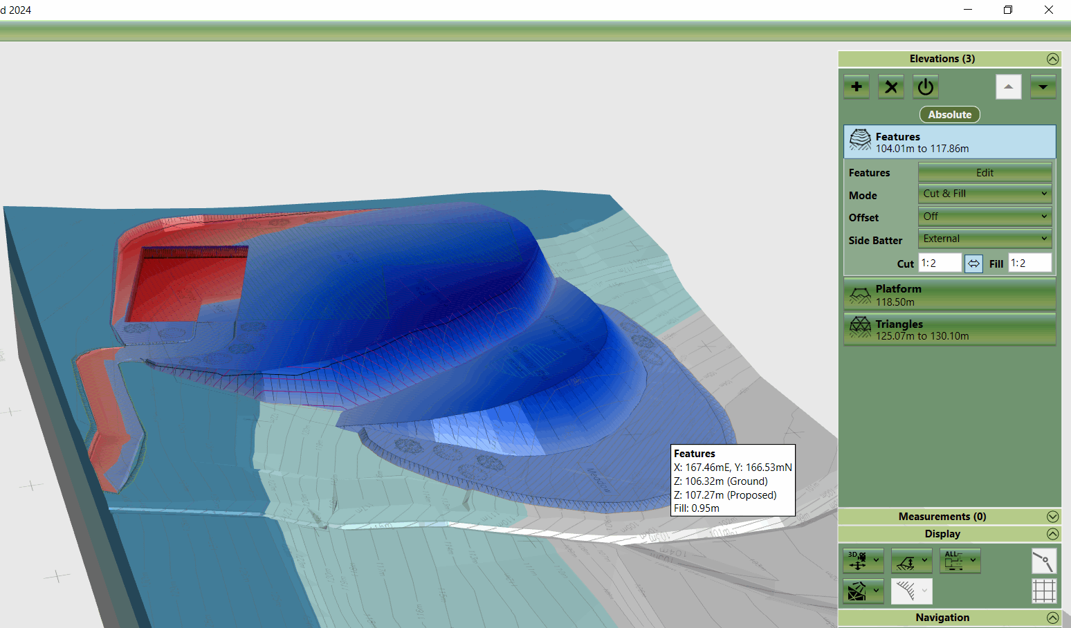 Using Kubla Cubed elements such as the Feature Surface, Platform, or Triangle Surface, you can define the element and then edit the side batter to generate a wall. For example, the image below shows a terraced landscape using the three elements mentioned previously. Watch our video on retaining walls to see how this is done.