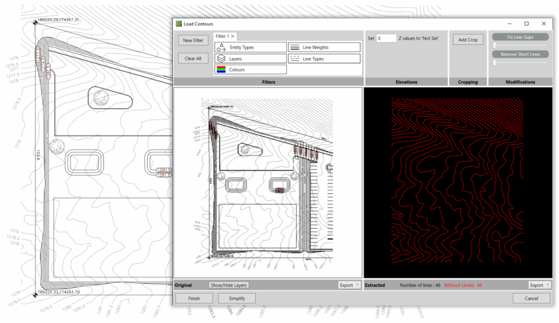 CAD files can contain all the necessary data to create a detailed surface in a few clicks. They may contain points, breaks, boundary outlines and contours. Within a CAD file, you can logically separate different entities into their own layers so you can have the contours in ‘Proposed Contours’ and ‘Existing Contours’, making it easy to select what you need during the import process.