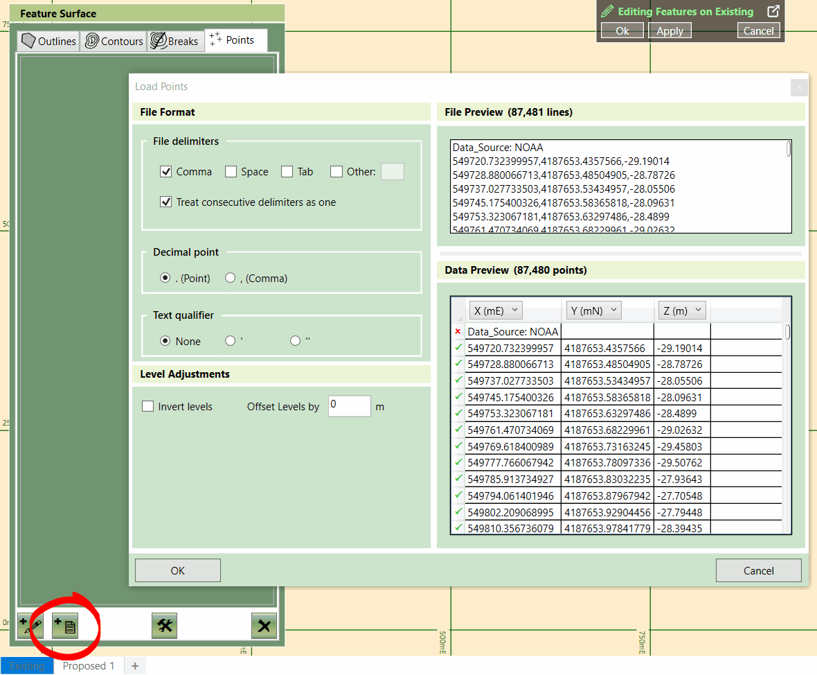 Point files are created during a topographic survey. They are a very simple format consisting of a text file with X,Y and Z co-ordinates separated by a special character (e.g. a comma). They can be imported into a 'Feature Surface' by selecting the 'Point' tab and selecting ‘Add from File’. Using point files is very fast and accurate as the points are usually raw survey data. However, the point files do not support break-lines meaning that detail in regard to hard edges cannot be imported efficiently.