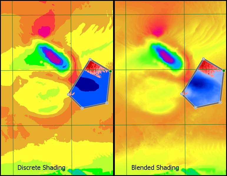 Shading ⑥ - There are two different shading options: Discrete and Blended. With Discrete shading, colours are not blended, resulting in discrete blocks of the same colour. When Blended is selected, the surface is shaded by smoothly interpolating between the colours in the colour table. See the image below for an illustration of the difference between these two shading modes.