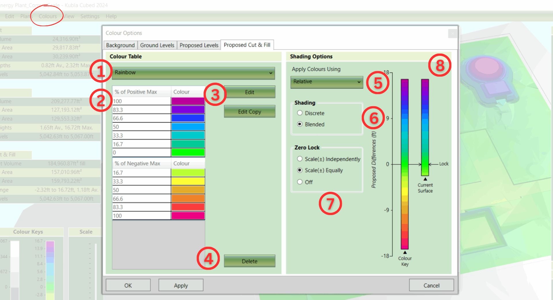 The shading schemes used to display the terrain and earthworks are customisable by the user. Kubla Cubed comes with a number of pre-set colour tables with options for user customisation, such as choosing between discrete and beleded shading.