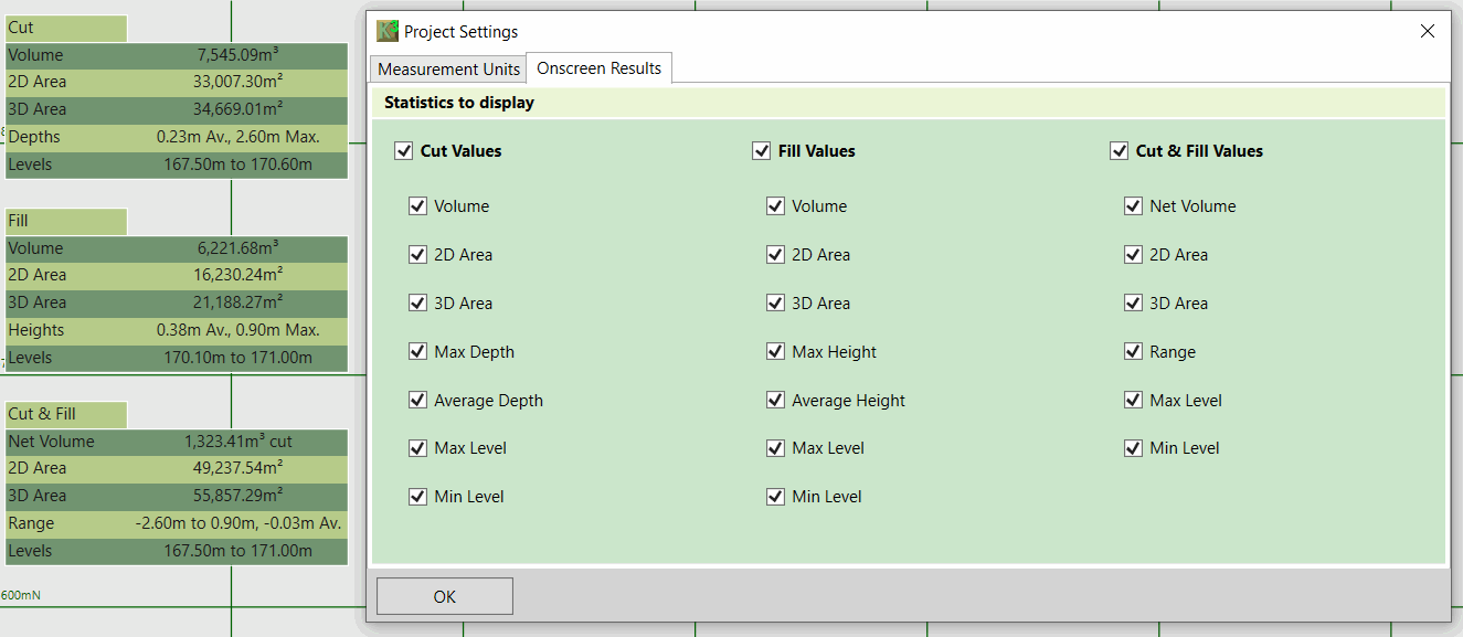 The Cut, Fill and Cut & Fill summaries for the selected phase are displayed in the top left corner. These are hidden while editing elements. Options determining the level of detail are set within the Project Settings, which are found in the top menu under Settings → Onscreen Results.