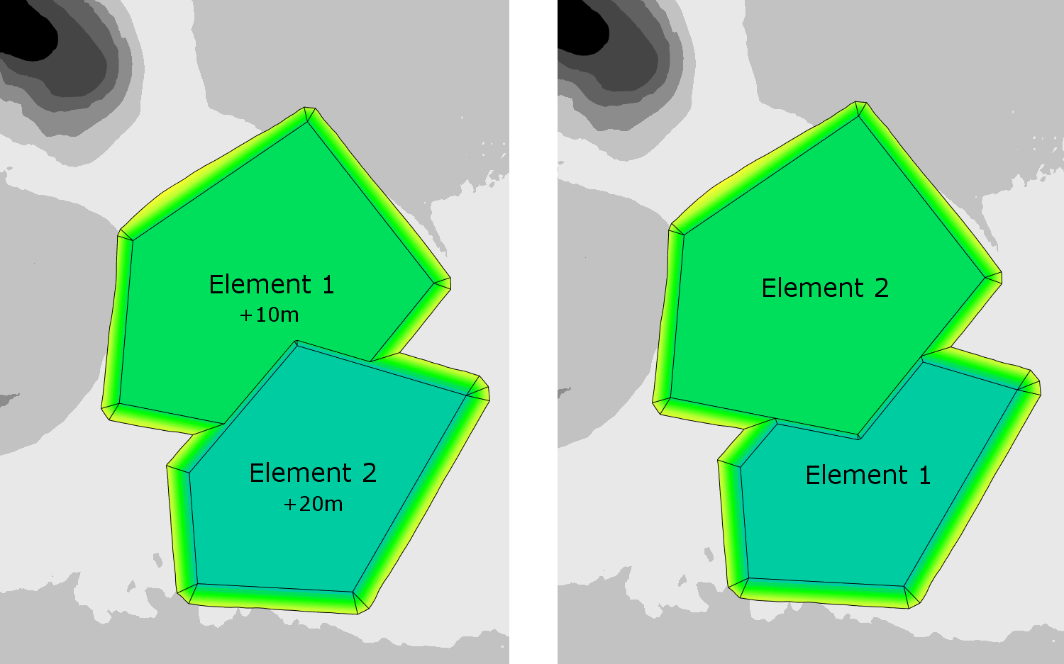 The image below illustrates the example described above. These two elements intersect at different levels, and they are both in 'cut and fill' mode. If the element at +10m is above the element at +20m in the calculation order (left image), then the higher element will fill over the top of the lower element. However, if the calculation order of these two elements is reversed (right image) then the lower element will instead cut material out of the higher one.