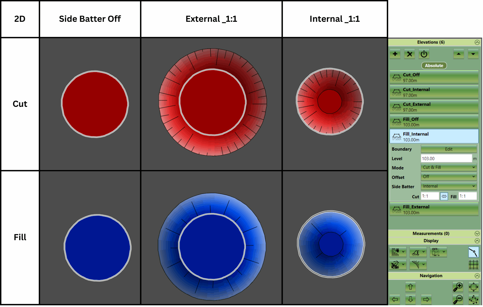 The images below shows how the side batter impacts the cut and fill volume for 6 identical circle platforms. In this example, all of the circle boundaries are identical in shape, with either a cut or fill of 3 metres. In the 2D view (below), the incline lines show the direction of the external and internal side batters. This is something to bare in mind when altering the side batter settings.