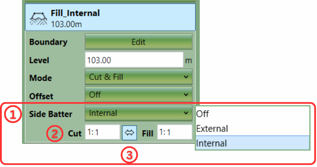 For each element, you can set the Side Batter ① to 'Off', 'External', or 'Internal' (limited). Then set the ratio ②. The Side Batter, set as a ratio of vertical to horizontal, determines the angle of the side slopes on an element. It is set to a default of 1:1.
