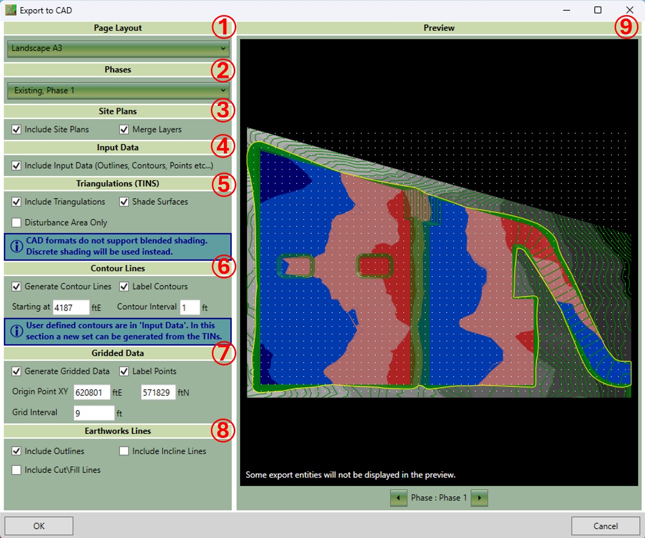 - ⑨ Use the preview to get an indication of the drawing file's content. It is especially useful for previewing the density of the generated gridded data and generated contour lines. Note that this is only a preview, and your drawings will not appear exactly as presented here. When multiple phases are selected, you can cycle through them for preview using controls at the bottom of the preview panel. Multiple phases are not previewed all together to avoid confusion.