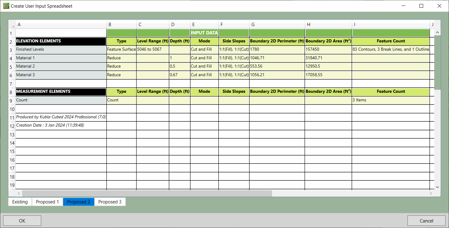 The spreadsheet will contain the input data that has been entered by the user into the program. It contains no information regarding earthworks calculations (cut & fill); that information is contained in the earthworks estimation data spreadsheet. The count, area and length measurement elements will only appear in this report as they have no relevance to the earthworks estimate.