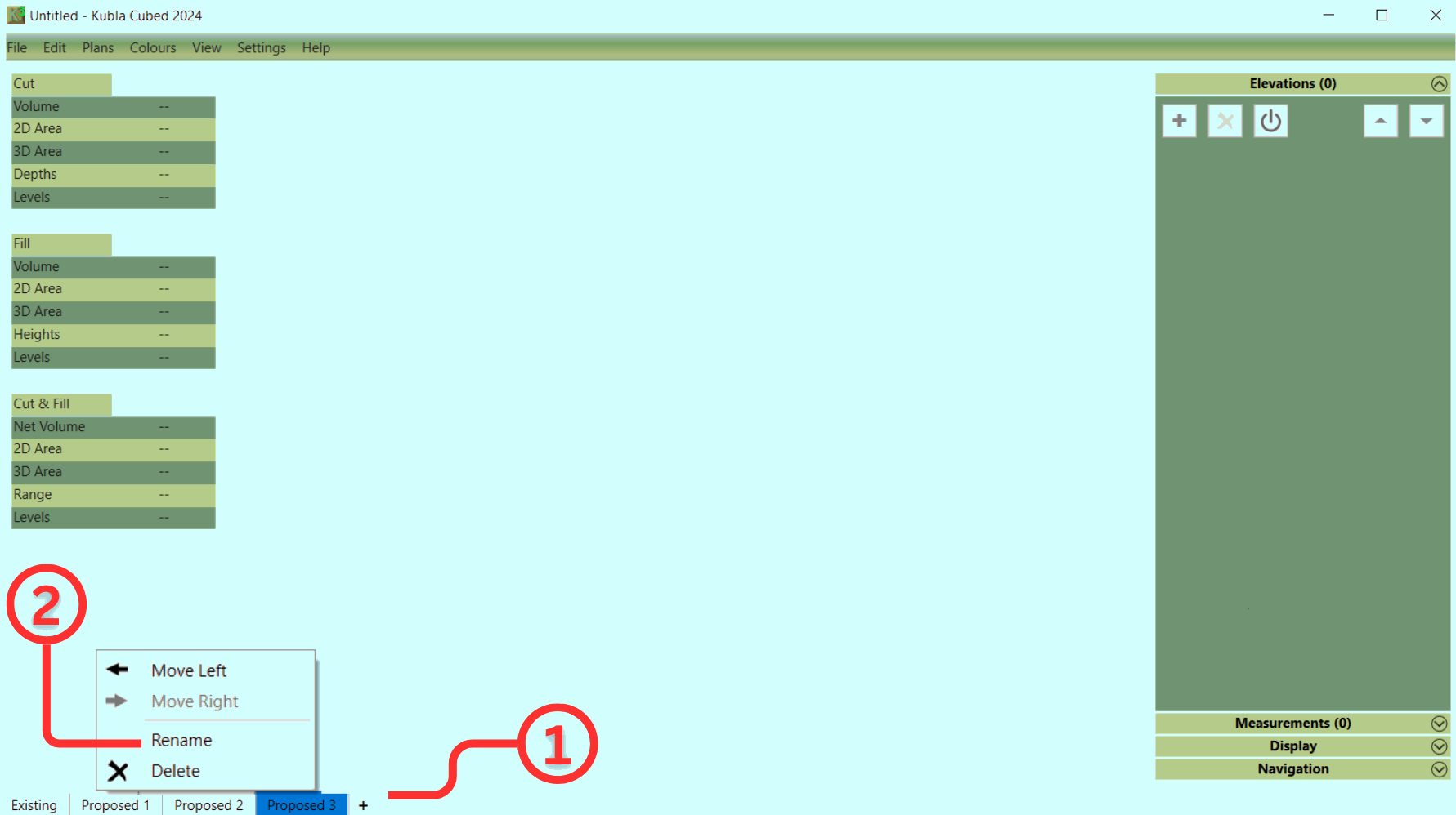 In Kubla Cubed the tabs ① that run along the bottom of the screen are referred to as 'construction phases' or just 'phases'. Elevation and Measurement elements that you create will be added to the selected phase only, the volumes shown on the screen relate to the selected phase only rather than an accumulation of all volumes in the project.