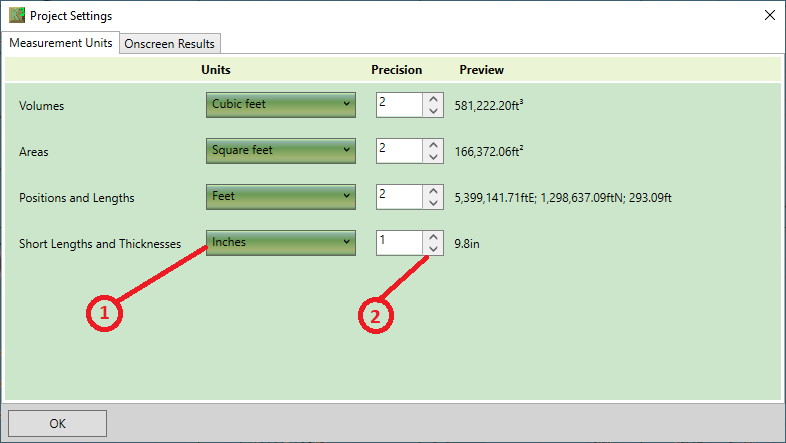 ① Units - For each measurement type (volumes, areas, positions and short lengths), you can select the desired unit of measure. It is recommended that you do not mix imperial and metric units together. For instance, if areas and volumes are set to yards, then positions should be set to feet.