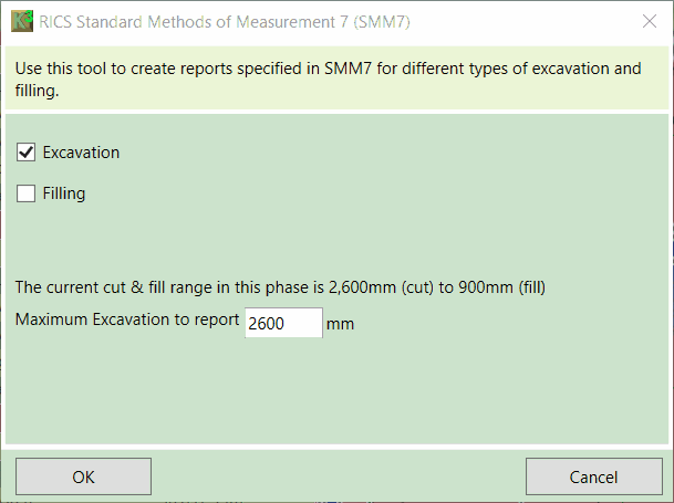 [4] Alternatively, Kubla Cubed can report by depth bands in a similar way to SMM7 excavation and NRM2 Cut & Fill. However, it should be noted that this does not adhere to the standards specified in the guidelines for SMM7 Fill.