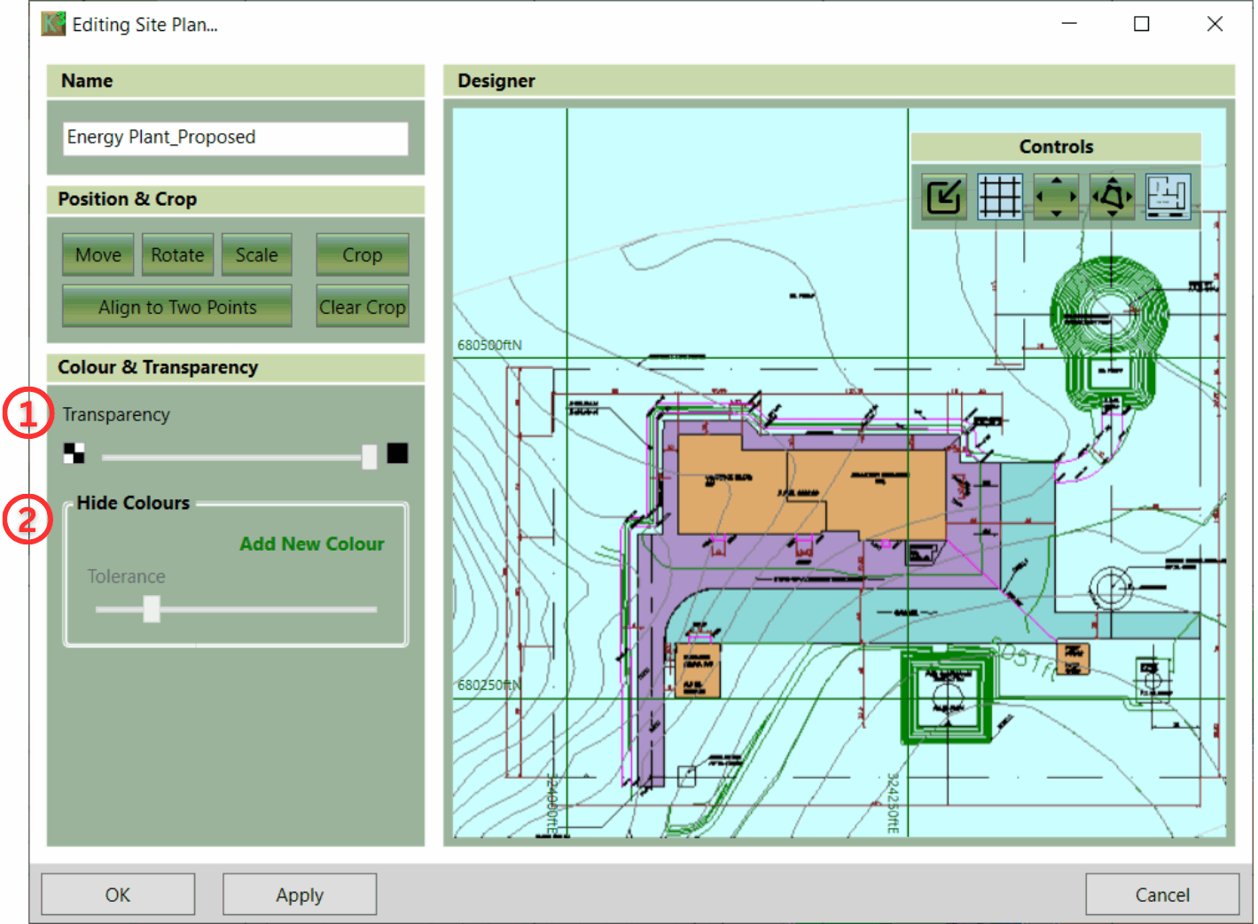 Since the site plan will be displayed on top of the existing terrain and earthworks, it is necessary to give it transparency, allowing visibilty through the plan to the layers below. In many cases, the default transparency settings will be suitable. However, when the transparency needs to be adjusted, this can be achieved using the controls shown below.