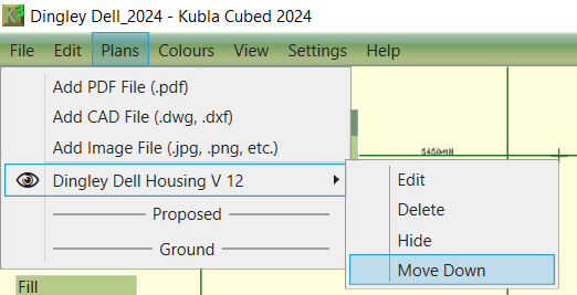 To display your site plans on the different surfaces go to the 'Plans' menu and hover over your listed site plan to reveal the list and the option to 'Move Down' (Move Up will appear as an option once the site plan has been moved below "--Proposed--").