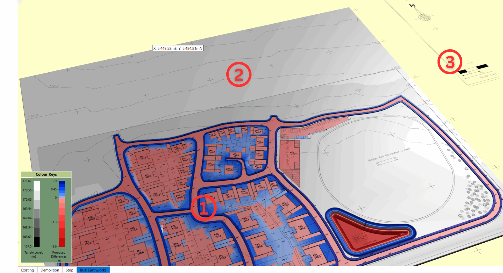 - ③ Surround - the coloured background area outside of the model, which may show your site plan, where there is no ground or proposed topography.