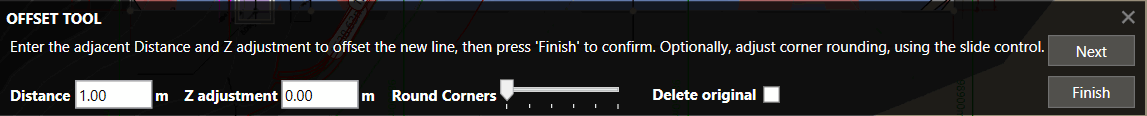 NOTE: If the single click (with crosshair) is within a closed line, the offset line will also be closed, provided the entered distance does not prevent a valid offset. In all other scenarios, the offset line will be outside the original. If the preview does not display the desired outcome, the Z adjustment and distance can be modified until the 'Finish' button is pressed.