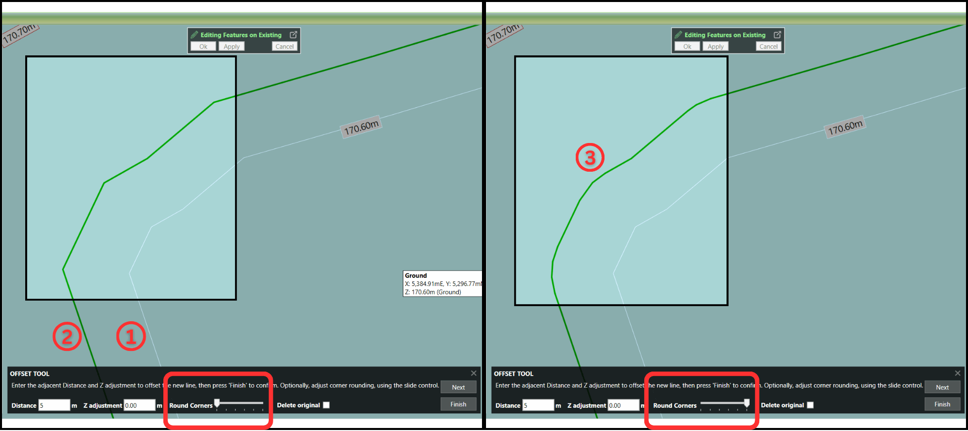 Rounded Corners are useful if you want to soften corners or buildings or contours. The image below shows the original contour ①, the offset contour before rounding ② (on the left) and the offset line after the corners have been rounded ③ with the slider slid to it's maximum (right).