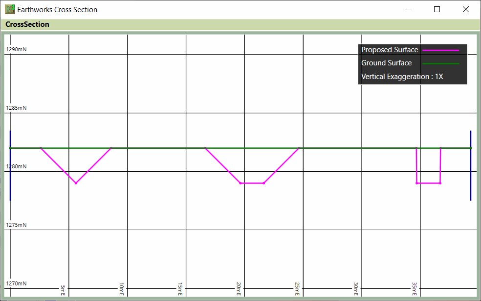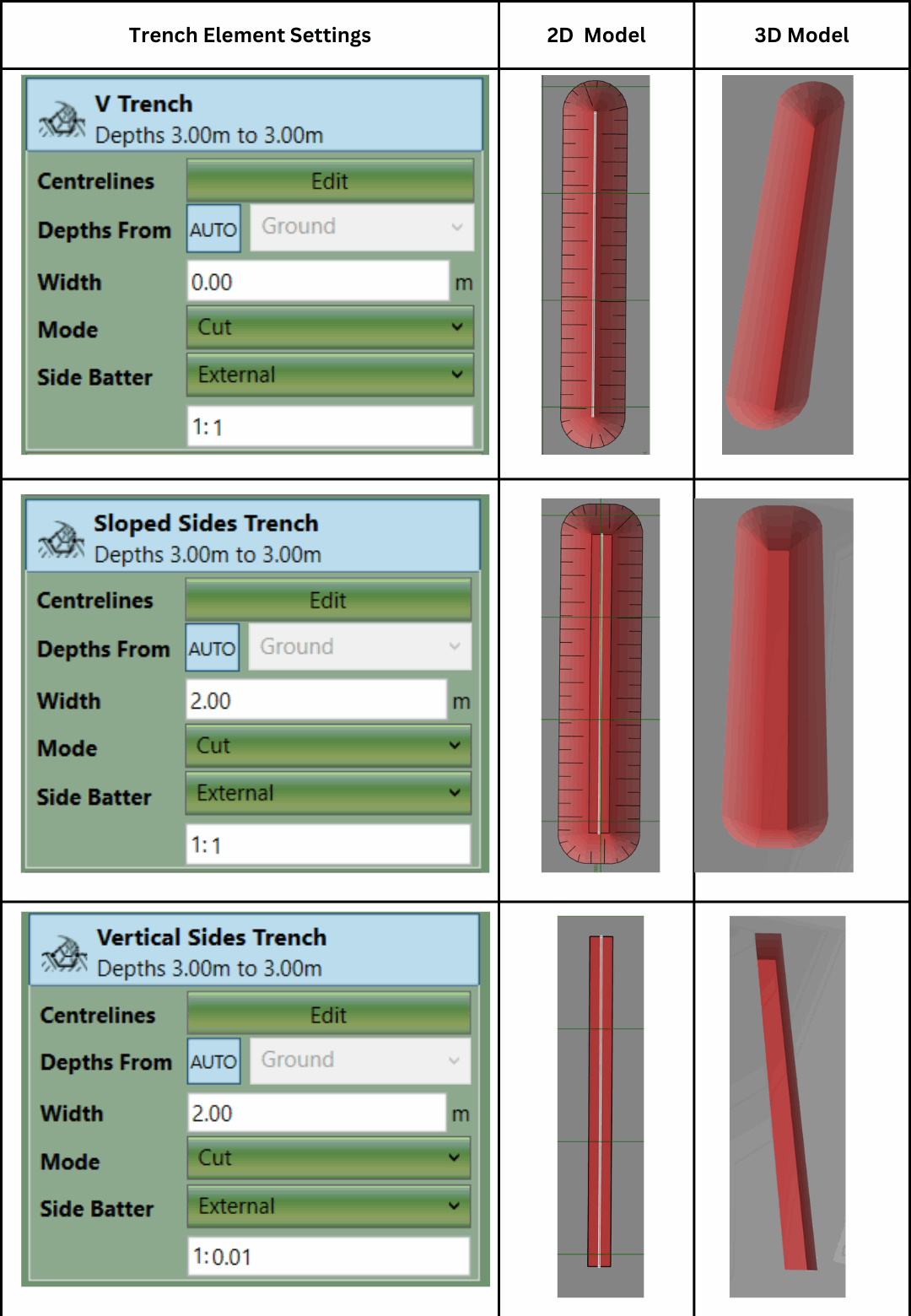 With some small changes, you can adjust the appearance of a trench. After defining a centreline and setting the depths, adjust the Width of the trench and Side Batter to generate different styles of trench. Three examples are shown below: